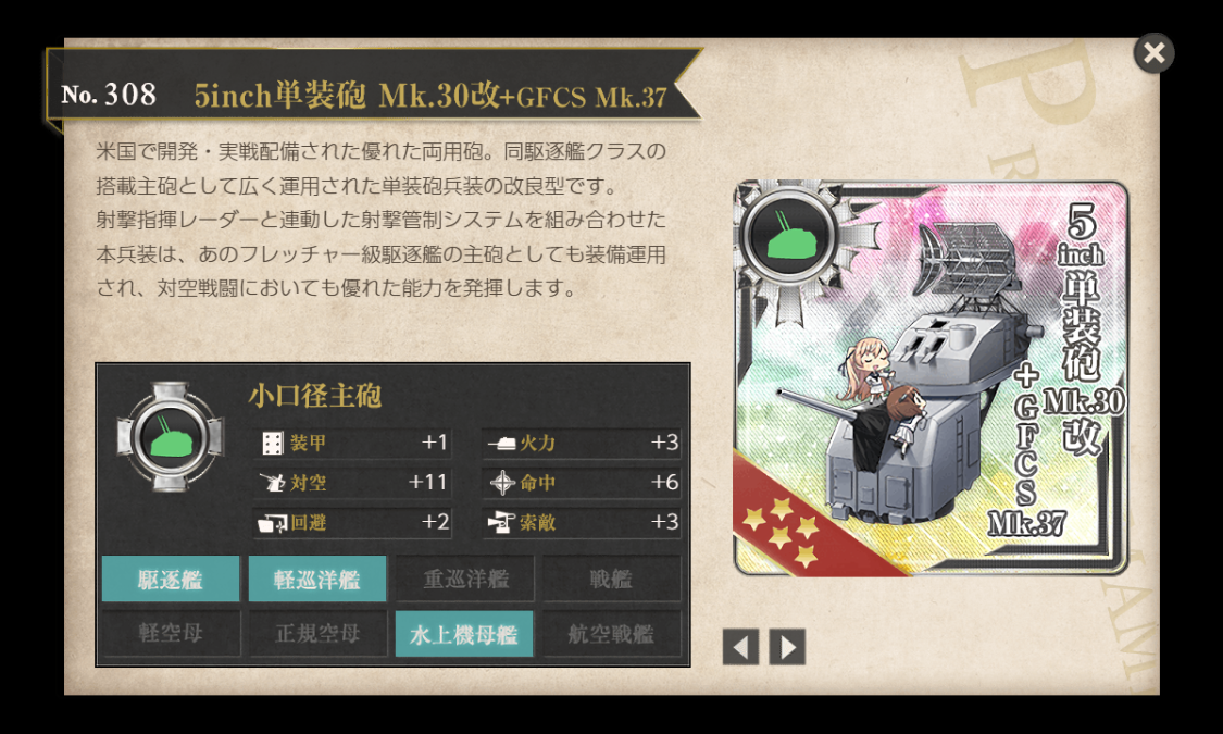 綾波に電探を持たせるか主砲を持たせるか迷いましたが、5inch単装砲 Mk.30改+GFCS Mk.37を持たせると丁度火力が78になり、下手な改修主砲よりも命中が伸びることに気付きました。おまけに中射程。いい感じです。
