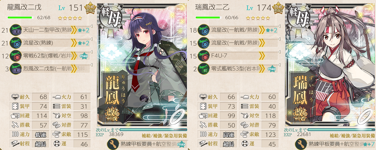 今回は流星改(一航戦/熟練)を2つとも瑞鳳乙に持たせてみました。今までは21機スロットの龍鳳戊に装備させていましたが、龍鳳戊をなるべく旗艦で固定したいと考え、瑞鳳乙の方につよい装備を寄せることにしました。