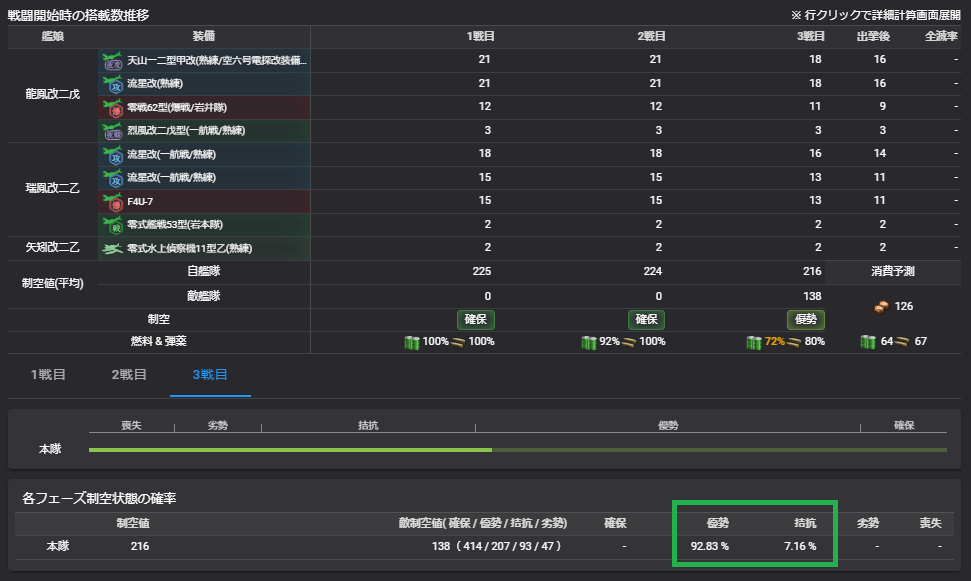 軽空母2隻だと制空値がやっぱり厳しいです。7%程度で拮抗に落ちてしまうみたいで、そうなると戦爆連合カットインを出せずに軽空母達の攻撃力が物足りなくなります。今のままでもかなりいい艦載機を使っていますが、次のイベントで何か革命が起きたらいいな~と思っています。