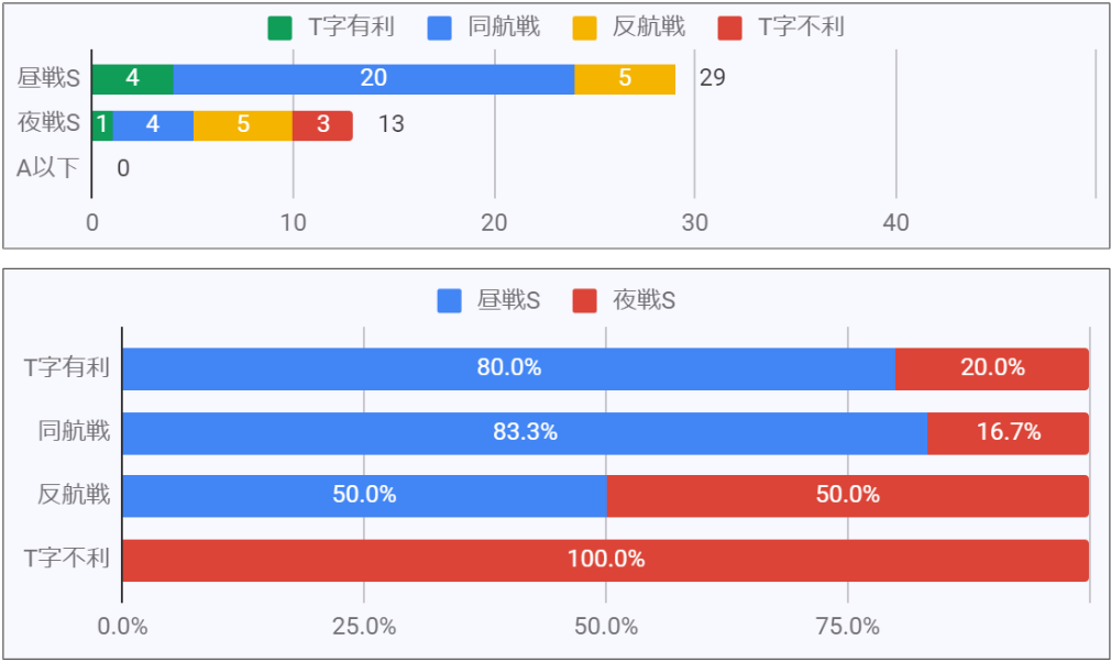 ボス42戦のうち、昼戦S勝利が29回、夜戦S勝利が13回でした。