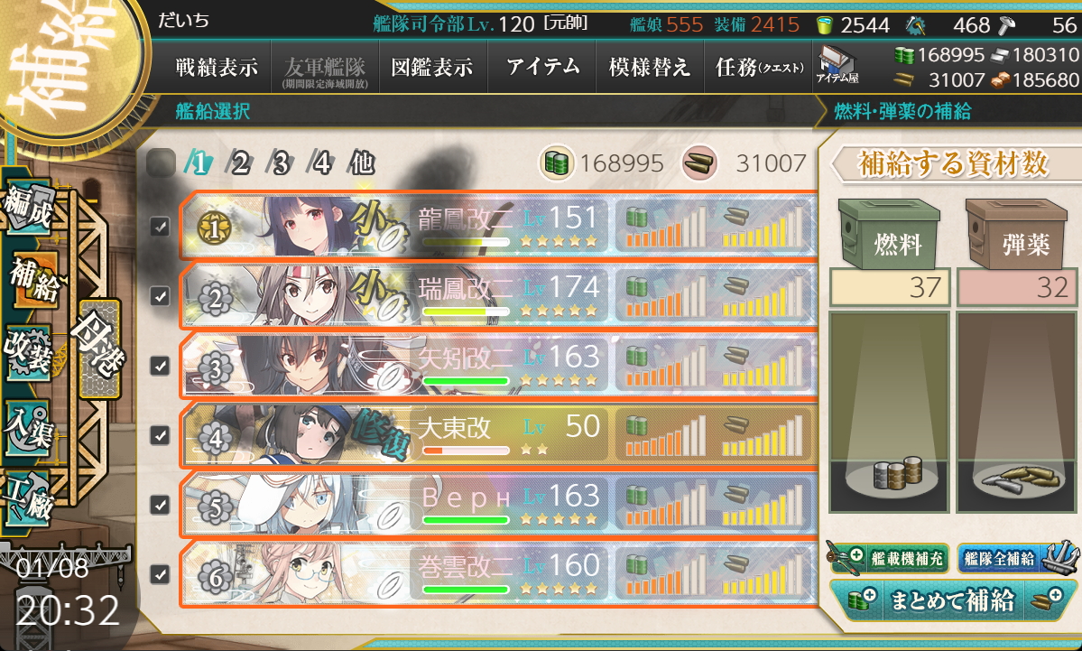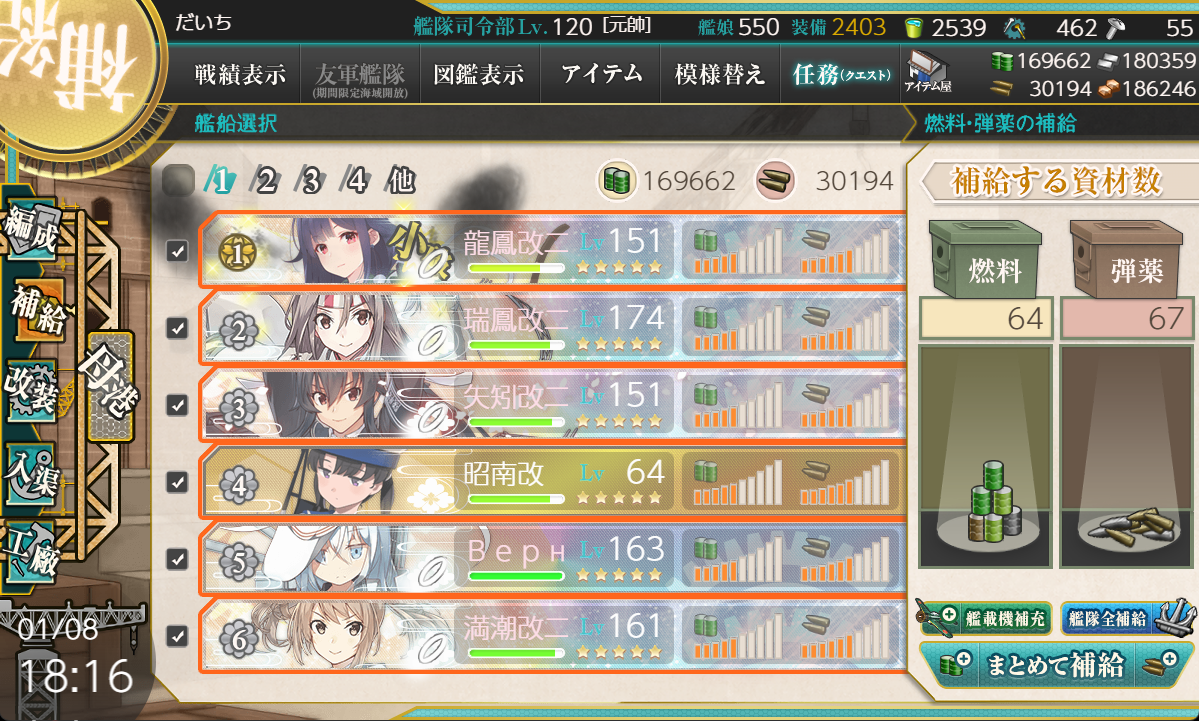 残りの4隻は前の編成と同じです。龍鳳戊と瑞鳳乙で旗艦をローテーションしながら周回していきます。