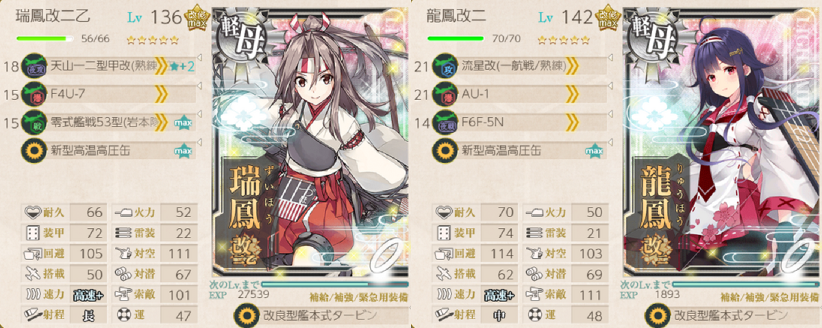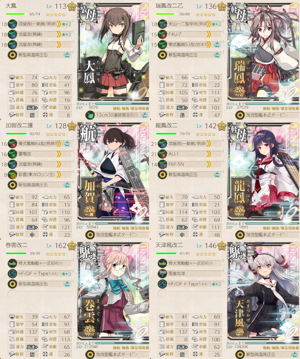 未改造大鳳の評価は保留です。この編成の開幕が弱かったのは個人的に疑う余地がありませんが、艦攻の数も少なかったので、大鳳改にしたら解決するというとそうでもない気がします。未改造大鳳よわ!使ってられるか!とは思わなかったので、今後も編成に入ってくるようであれば使っていきたいです。