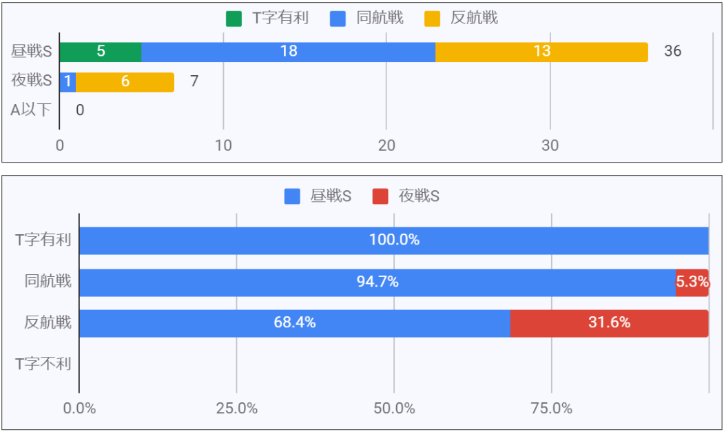 ボス43戦のうち、昼戦S勝利が36回、夜戦S勝利が7回でした。