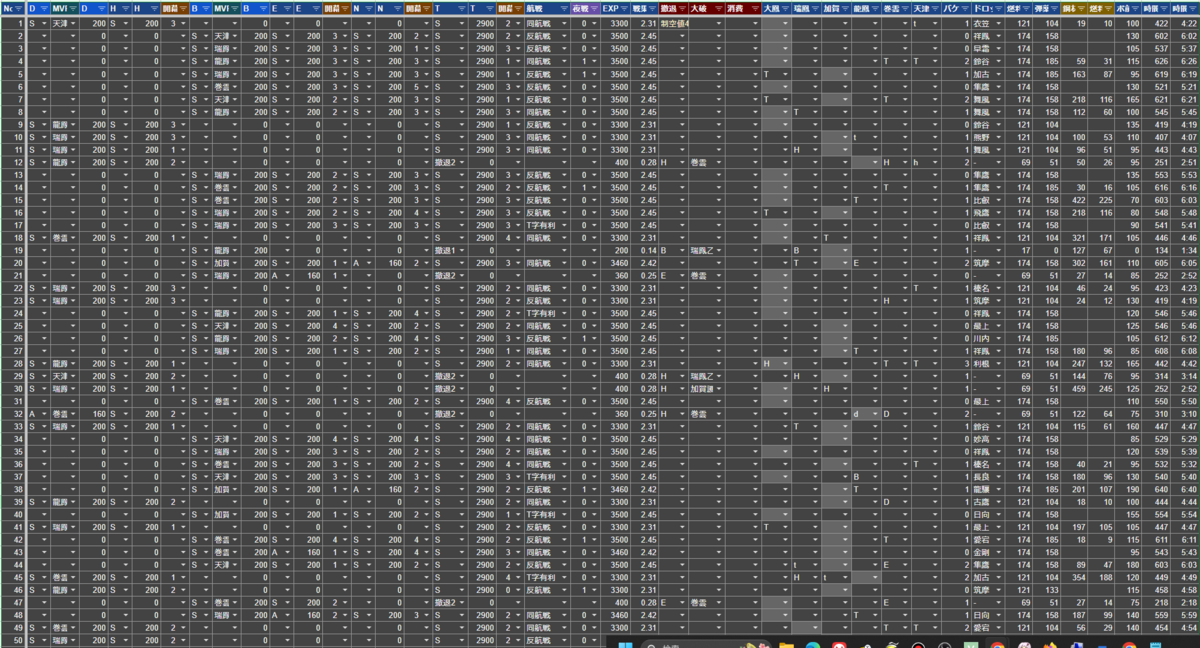 | 項目 | 50出撃 | /出撃 | /S勝利 | /1時間 | /100戦果 | 高速修復材の消費量内訳 |