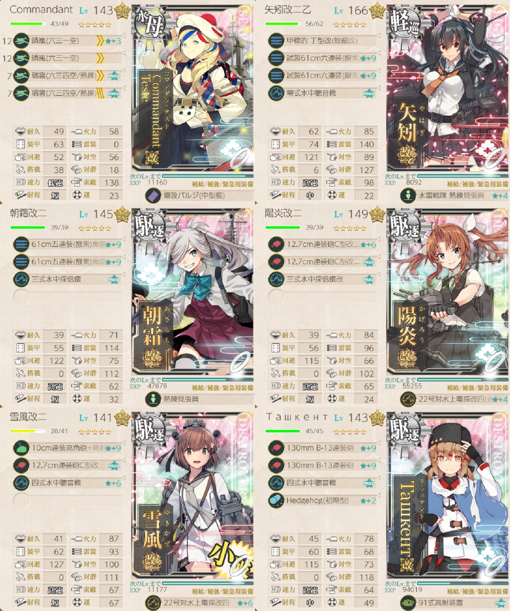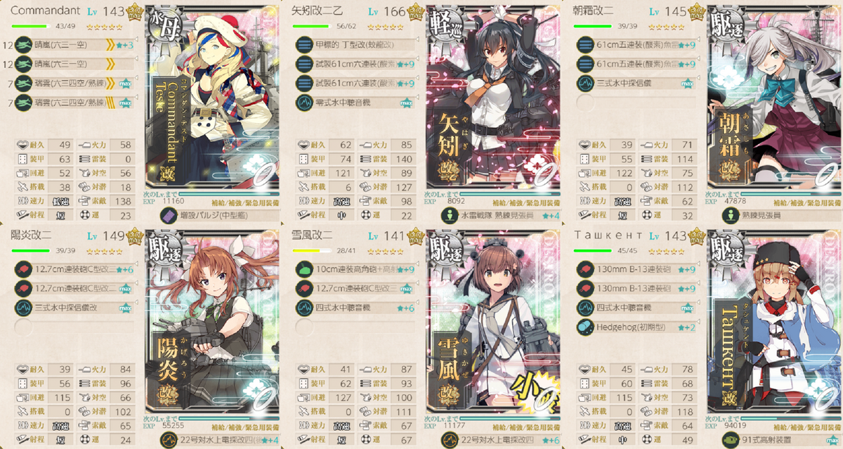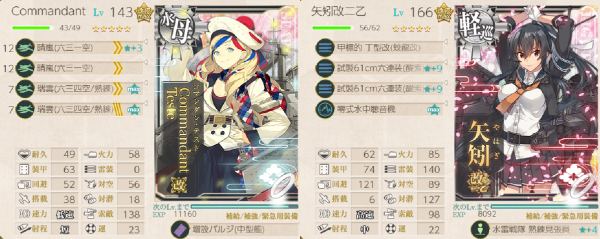 いつの間にかつよめの日進信者みたいになっていましたが、Commandant Testeもそんなに悪くないことを再確認しました。他の編成でもCommandant Teste入りを試してみようと思います。日進の方がつよいでしょうけどね。