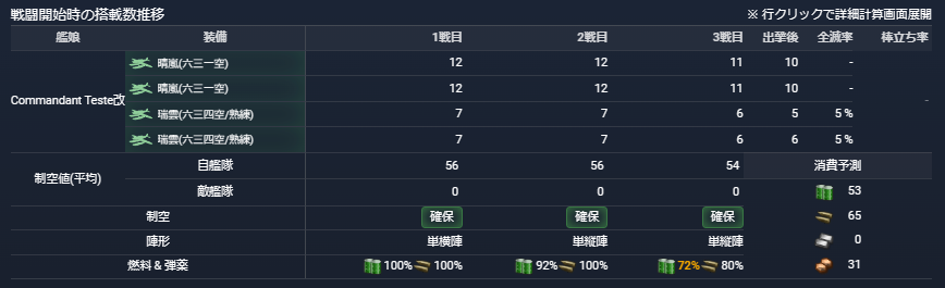 水上機母艦をCommandant Testeに変えています。日進を使った編成では航空偵察スコアが足りなくなる可能性があります。日進入り編成の出撃100回で1回成功になってしまいましたが、Commandant Testeなら4機装備できるのでその心配はありません。このCommandant Testeには瑞雲(六三四空/熟練)を持たせています。爆装が高い方がいいよな~とあんまり考えずに選びましたが、枯れてしまう可能性があるみたいです。
