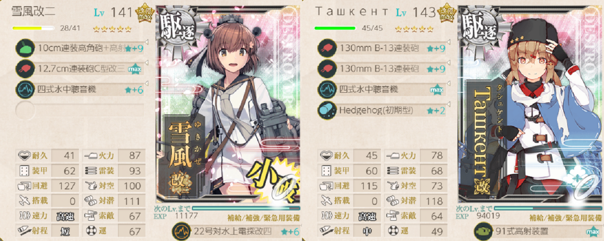 ТашкентがCマスでMVPを取り逃すことがちらほらあったので爆雷を装備させました。最近は砲撃戦攻撃力も対潜攻撃力も欲しくなってきていて、三式爆雷投射機 集中配備を叩こうかなと考え始めています。