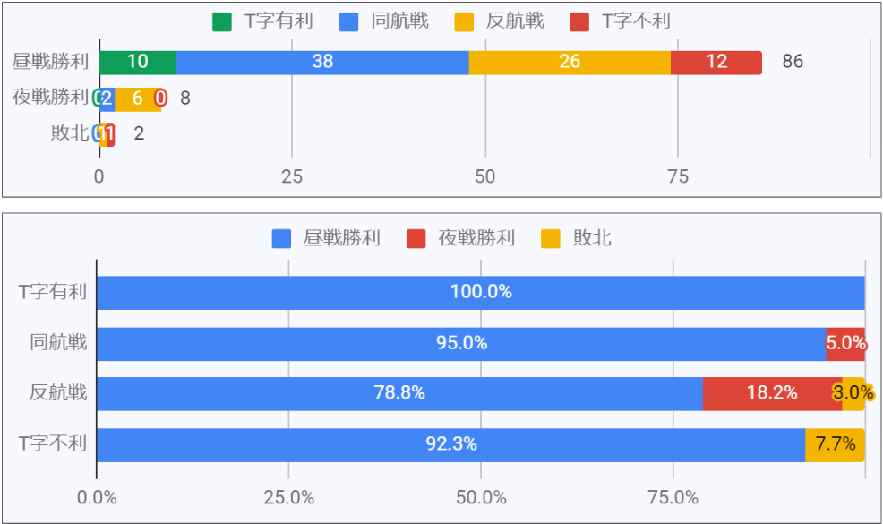 ボス96戦のうち、昼戦勝利が86回、夜戦勝利が8回でした。