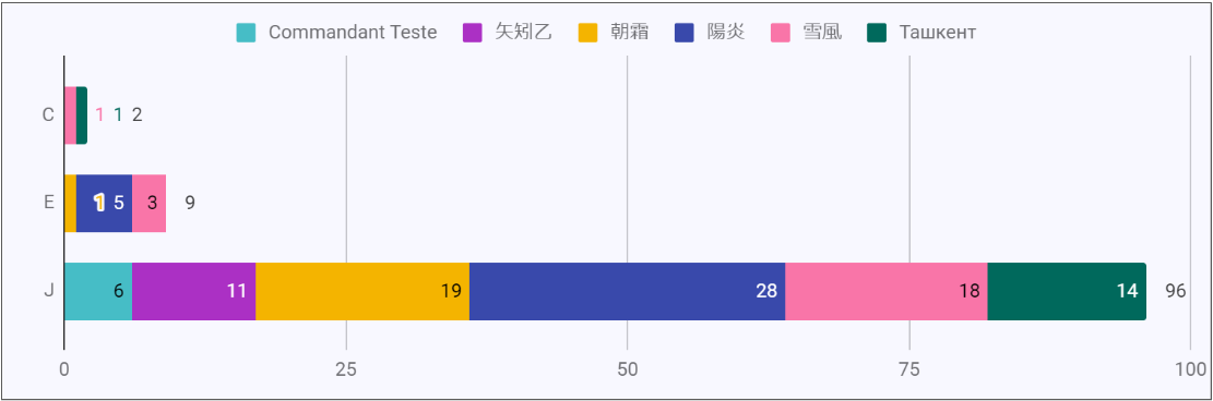 戦果は時給24.5、矢矧+日進編成の時給が25.26だったので少し落ちるくらいになります。Commandant Testeの射程が短なので、駆逐艦に水雷戦隊 熟練見張員を持たせて射程を中にした場合は少し差が縮まると思います。気になったのはCommandant Testeの方に夜戦敗北があったことで、2回ありました。周回時間自体はほぼ同じだったことを踏まえるとボス勝利率の差が戦果時速の差に繋がっていると言えるでしょう。