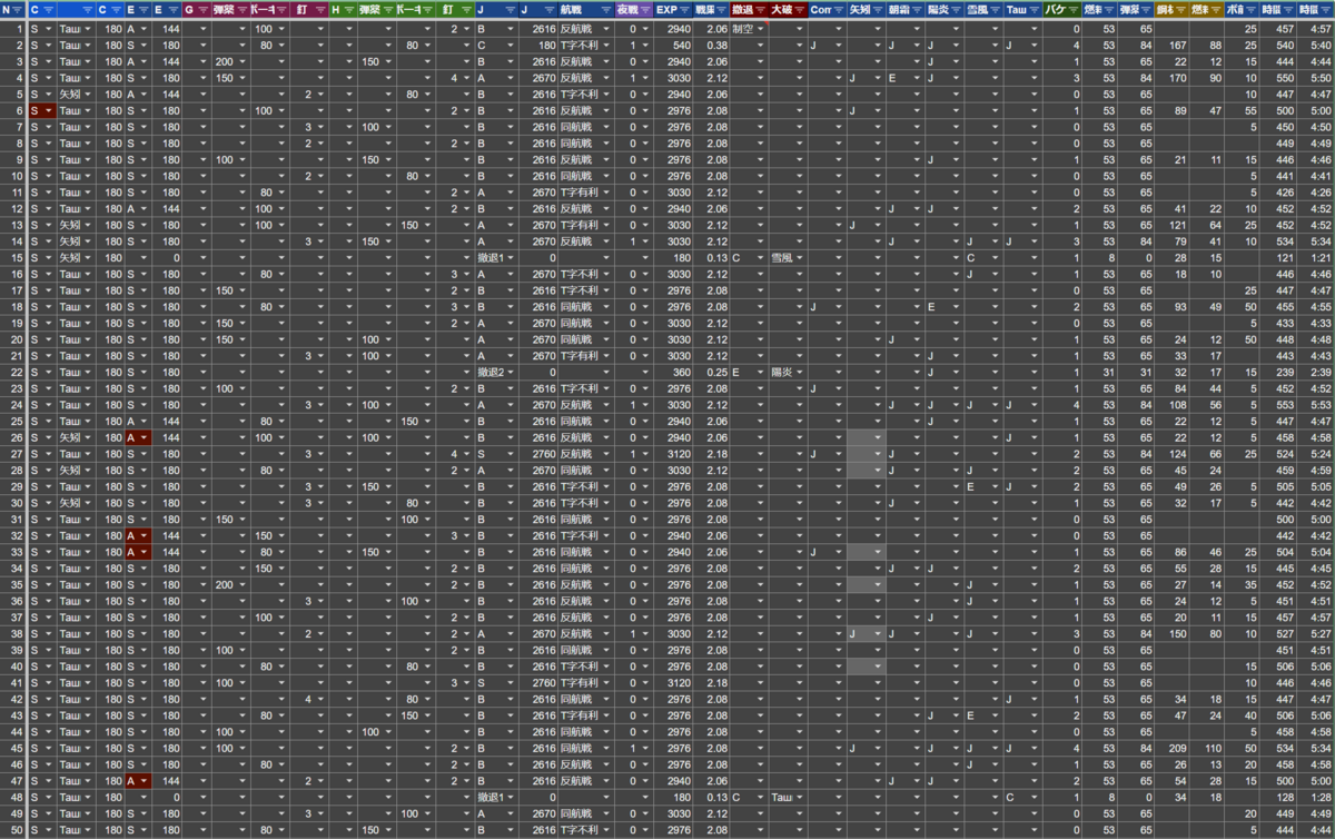 バケツの消費はトータルでほぼ同じになりました。Commandant Testeの編成が1.14/周、日進入りの編成が1.10/周でした。Cマスでのバケツ消費はCommandant Teste編成が日進編成の半分でした。Cマスの条件は同じなので、Commandant Teste編成が上振れたか日進編成が下振れたかのどちらかだと思います。Eマスは逆にCommandant Teste編成が日進編成の倍でした。日進編成の方が少ないことは直感どおりですが、倍はさすがに上振れ下振れがあったと思います。