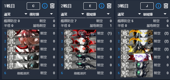 三隈特と矢矧乙の航空偵察スコアを鹿島で補う編成です。単縦陣で遊んでいるときから警戒陣で遊びたいと思っていました。