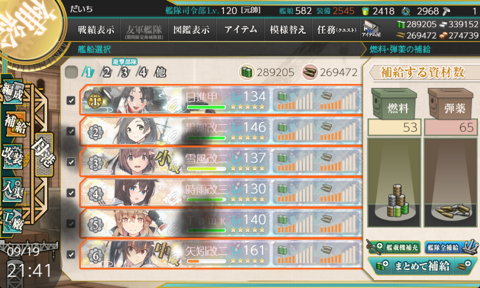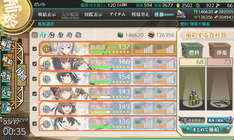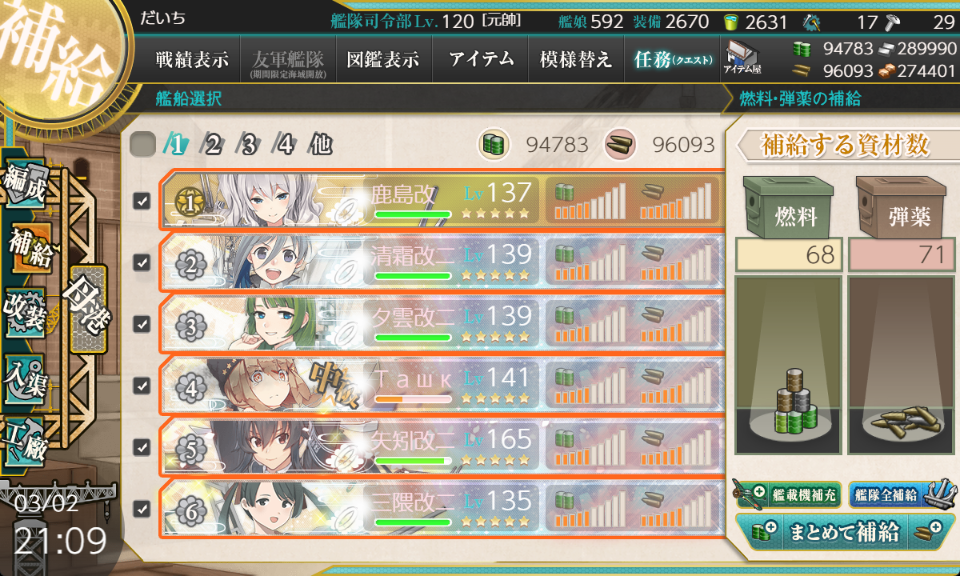 編成は全員ケッコンしていることを前提にして、鹿島+矢矧乙+三隈特の編成では燃料68, 弾薬71、駆逐+矢矧乙+日進の編成では燃料53, 弾薬65を消費します。普段の周回で軽巡に夕張特を採用している人ならば消費資源の差はより大きくなります。