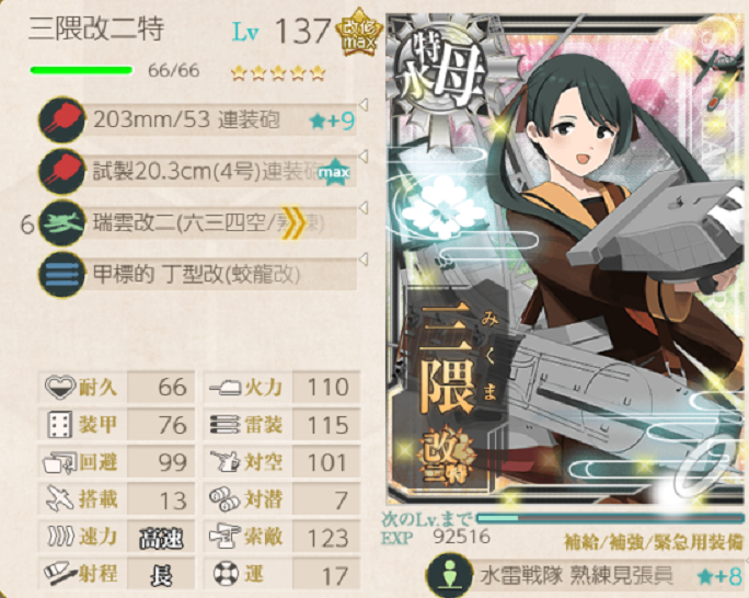 ……といった点を考えて、昼連撃を1隻に減らし、軽巡を主力艦の位置にあげることにしました。先制対潜5隻、甲標的2隻、昼連撃1隻を無理なく実現できるのは三隈特ならでは*1だと思います。Cマス単横陣編成が好きなだけかもしれません。