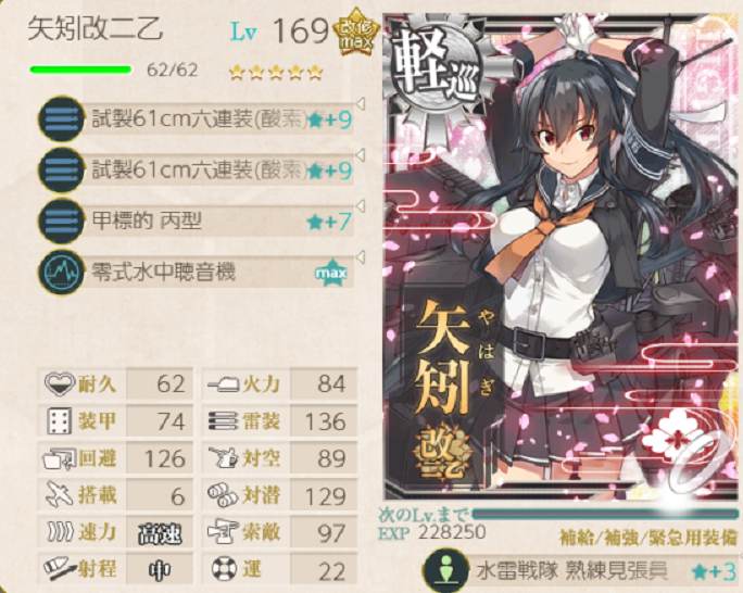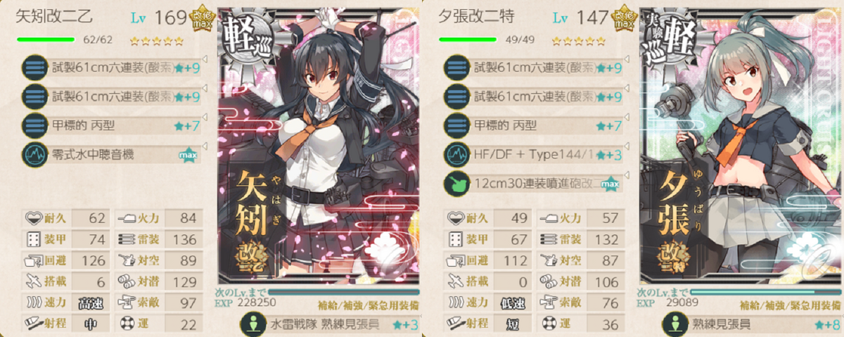 個人的には、夕張特は1スロ先制対潜をできるようになったら育成は十分かなと思うようになってしまいました。経験値は矢矧乙に優先して入れたいと考えていて、夕張特の出番はそこまで多くありません。が、夕張特はつよいと思います。