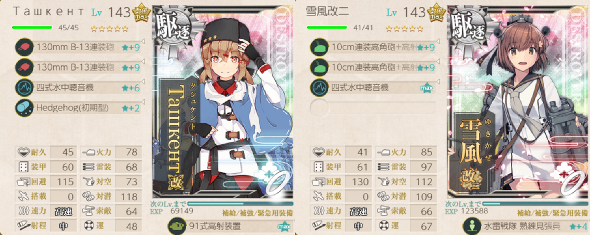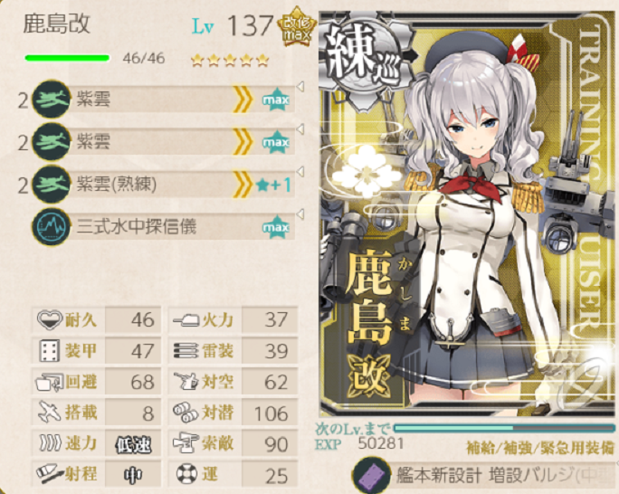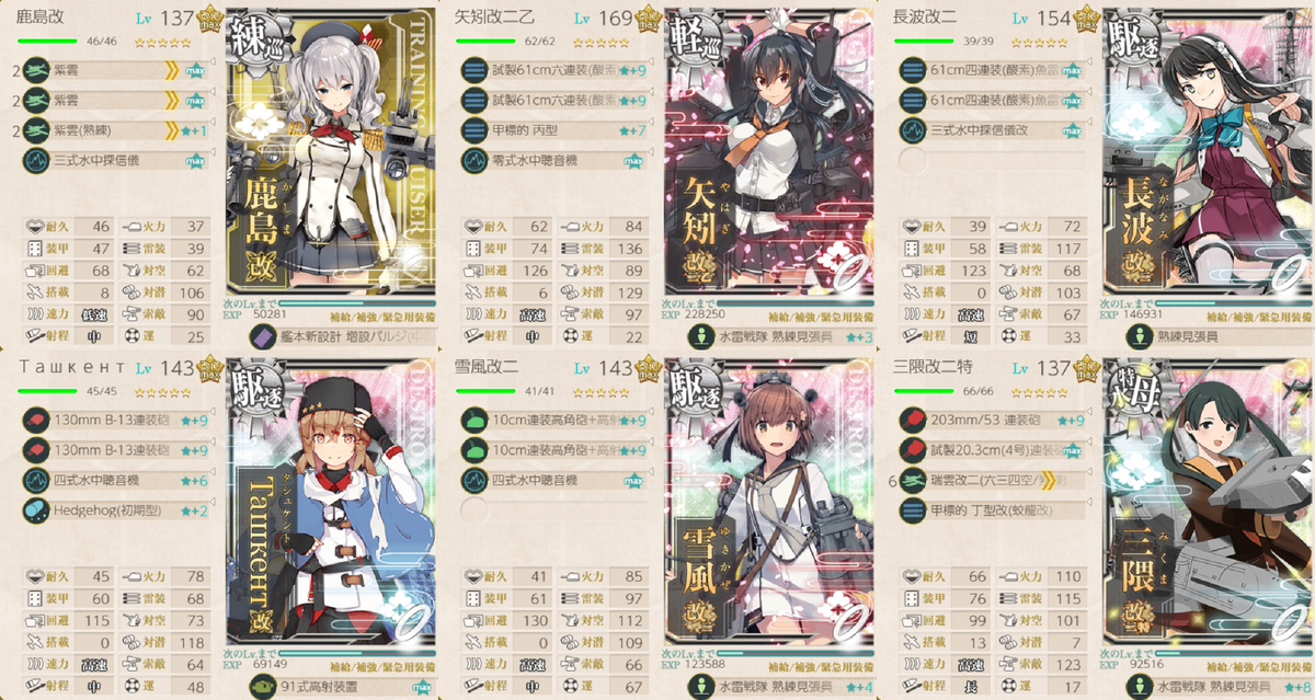 この編成の火力枠です。矢矧乙とセットで昼連撃をさせているときは射程中でもいいかな~と思っていましたが、今回は射程を伸ばしました。鹿島も矢矧乙もТашкентもいる中、砲撃戦で最初に動いてほしいです。