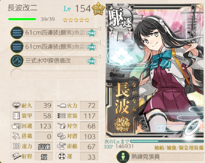 駆逐艦の水雷戦隊 熟練見張員を解禁しました。火力も雷装も対潜も回避も射程も伸びて大変つよいです。6-3の駆逐艦の装備で一番つよいと思います。使えるならバルジよりも電探よりも優先度は上だと考えています。