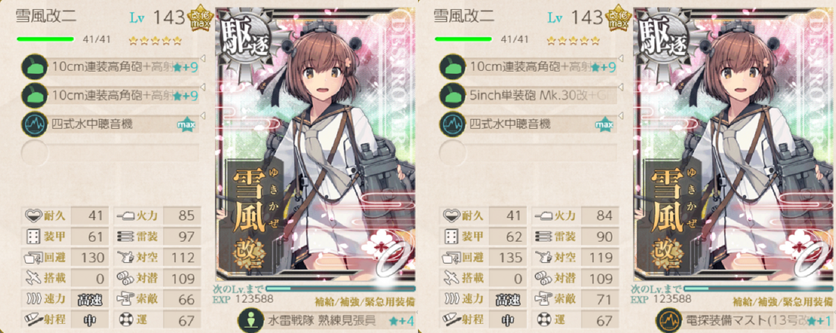 主砲と増設装備で十分な火力を稼ぐことができる駆逐艦なら、5inch単装砲 Mk.30改+GFCS Mk.37で射程を伸ばしても良さそうです。雪風は特定の電探を使うとボーナスで火力が伸びて、これくらいなら許せるかなってくらいのつよさになります。