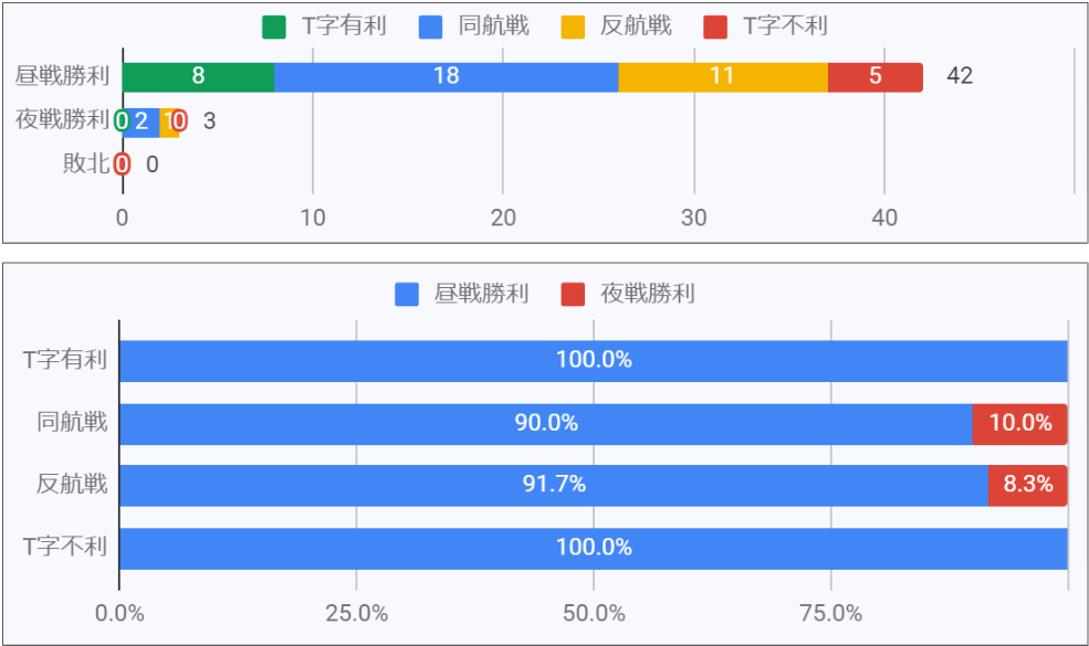 ボス45戦のうち、昼戦勝利が42回、夜戦勝利が3回でした。