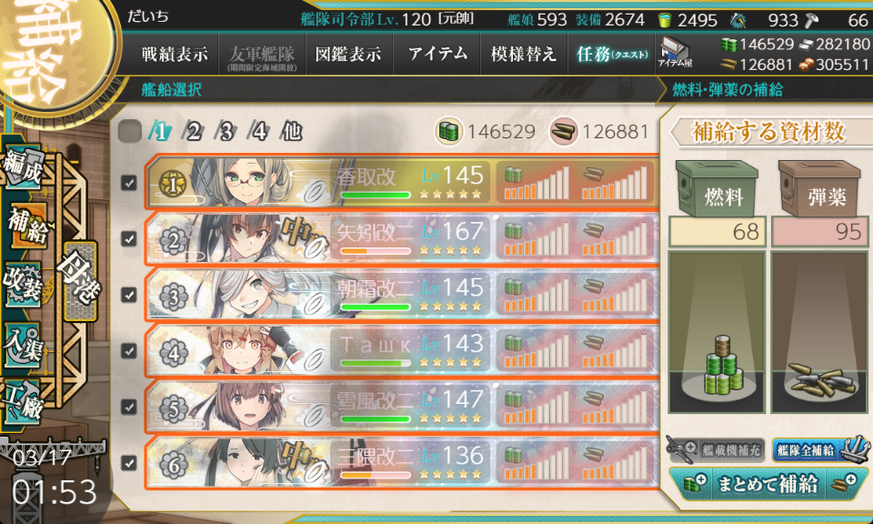 とはいえ、6-3で使うために普段バケツをためているようなものなので、6-3を周回するときはそこまでバケツ消費を気にしていません。しばらくは他の編成を使う機会の方が多そうです。が、選択肢が増えたのは良かったです。