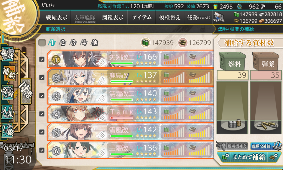 6-3です。三隈改二特、矢矧改二乙、鹿島の組み合わせで航空偵察スコアを稼ぐ編成です。昼連撃2枚の編成があまりつよくなかったので改善を試みます。