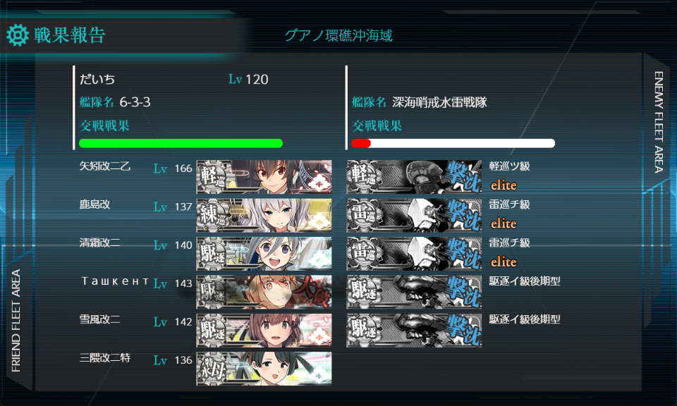 たのしく周回できました。矢矧乙と三隈特を5番目6番目に並べる編成で個人的に課題だと感じたところを改善でき、なおかつユニークな6-3編成になったと思うのでかなり満足しています。